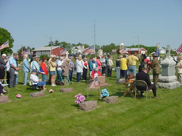 Tampico Memorial Day cemetery walk - Dr. H. Terry gravesite. Dr. Terry's daughter, Mary Ellen Terry Gholson is standing with green walker, gray coat, scarf. She is 92 and was a classmate of Ronald Reagan. Her son, Terry, also attended.